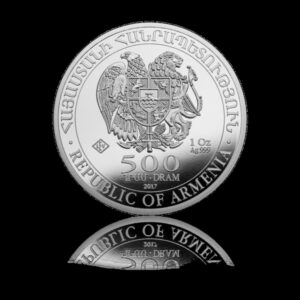 En el anverso aparece el escudo nacional de Armenia junto con la inscripción “República de Armenia” en armenio e inglés. También se detallan el peso y la pureza de la plata (“1 oz Ag 999”), el valor nominal de “500 Dram”, el año de acuñación y la marca del fabricante “LEV”.