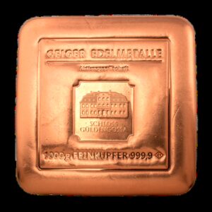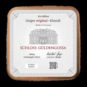 La barra de cobre de 1000g de la exclusiva edición Schloss Güldengossa es una creación excepcional de Geiger Edelmetalle.