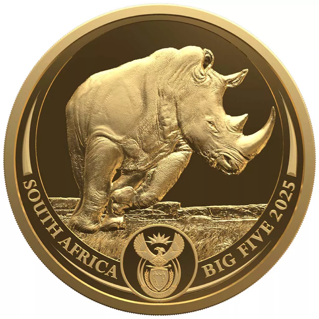 La Los Cinco Grandes III – Rinoceronte 2025 es una moneda de coleccionismo e inversión emitida por Sudáfrica, elaborada en oro de pureza 999/1000, con un contenido exacto de una onza troy (31,10 g) de oro fino.